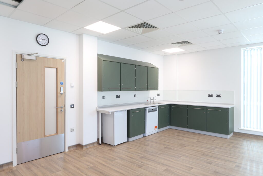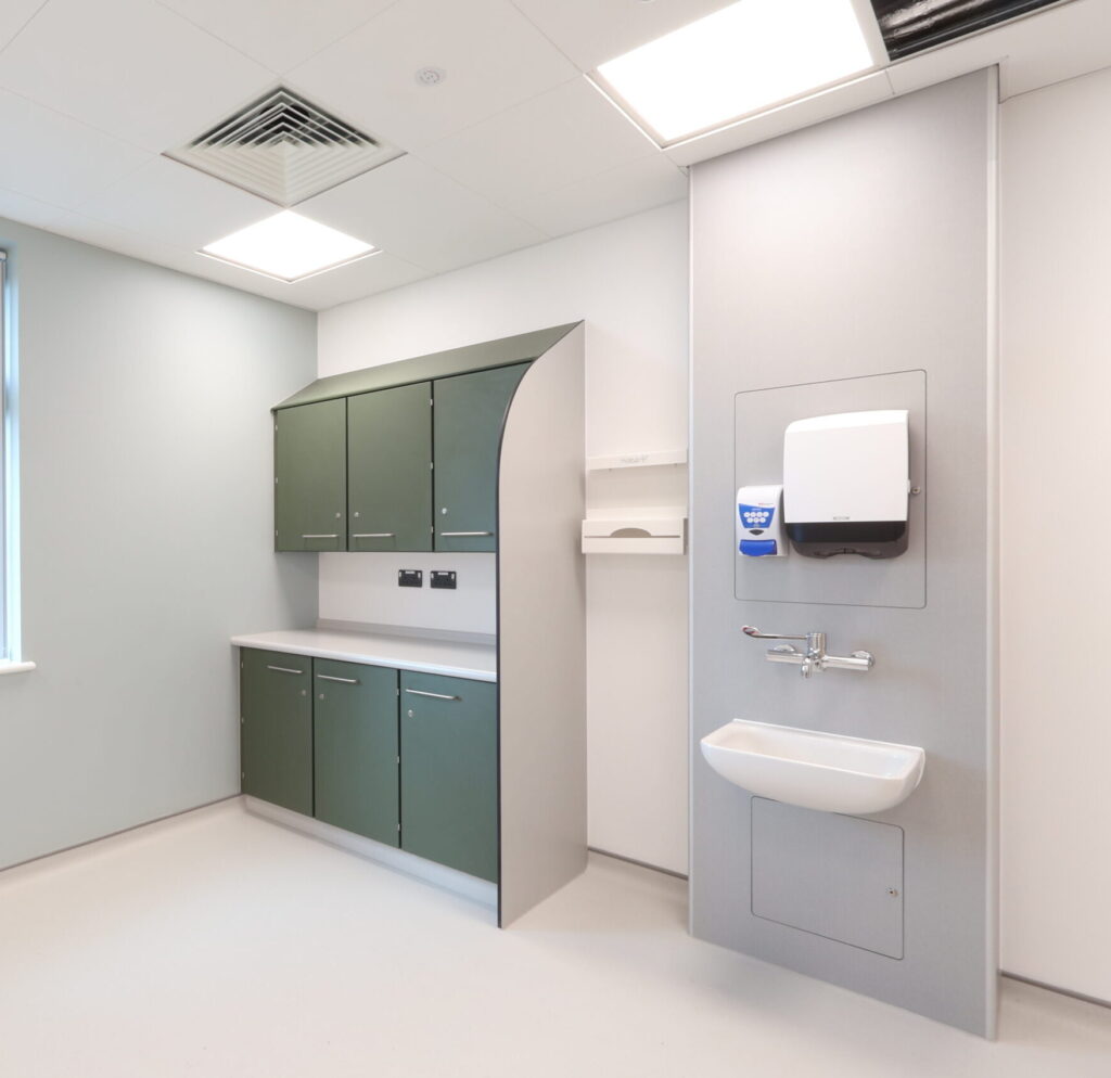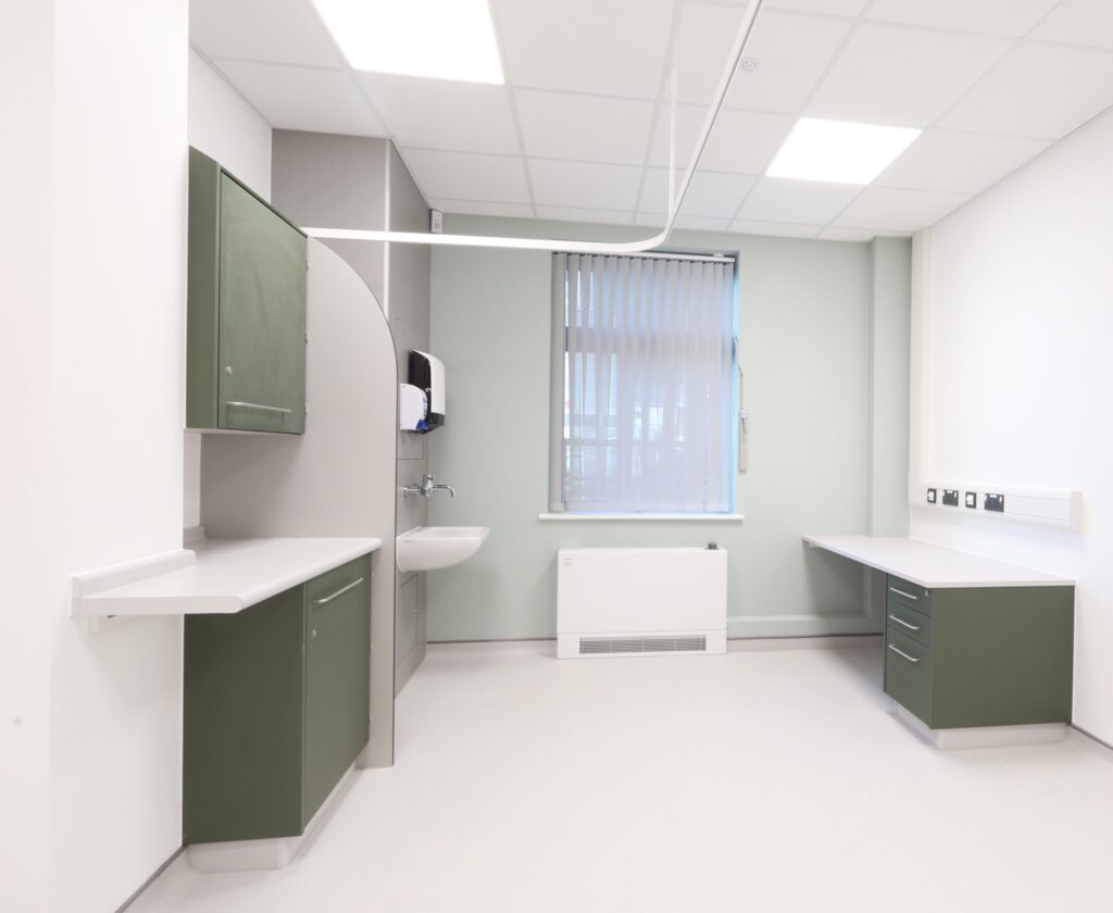 We supplied purpose-designed wall and base cabinetry tailored to healthcare workflows. Finished in Green Smoke doors with Clinical Light Grey carcasses, the units provide: