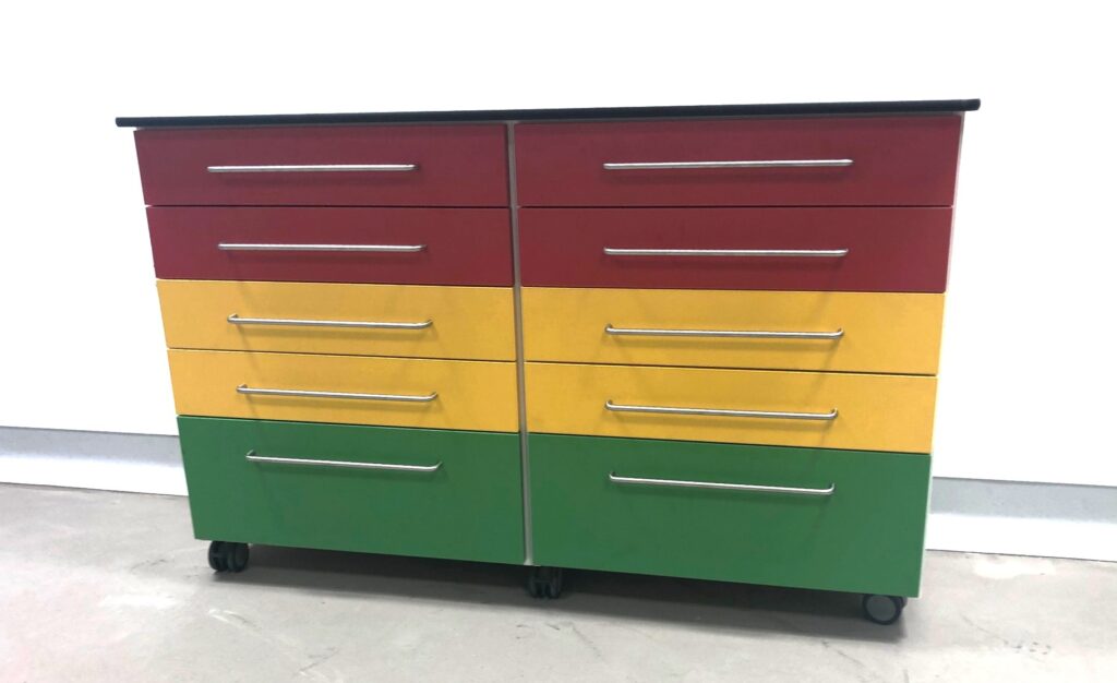 In the emergency drawer cabinet shown, the top drawers are designated for emergency equipment, while the yellow and green drawers indicate different types of stock.