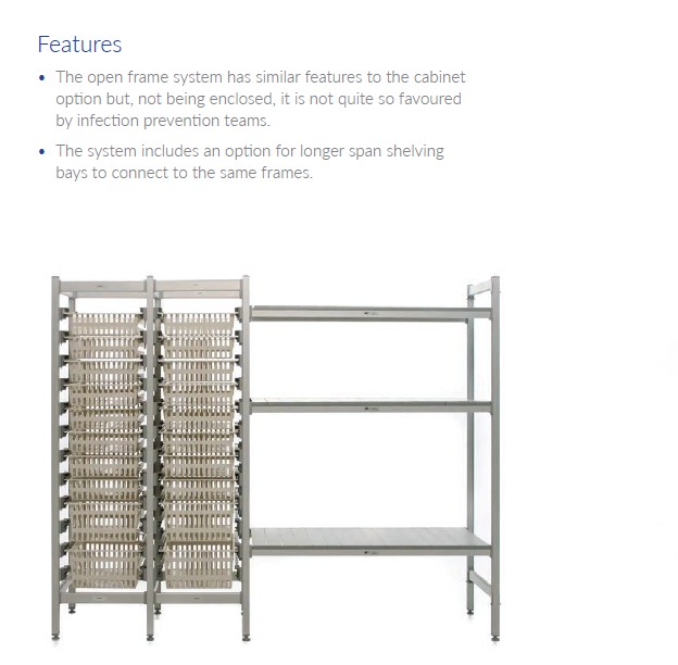 HTM71 Open Frame Systems – Similar flexibility to cabinets, with options for longer span shelving, though less favoured for infection control.