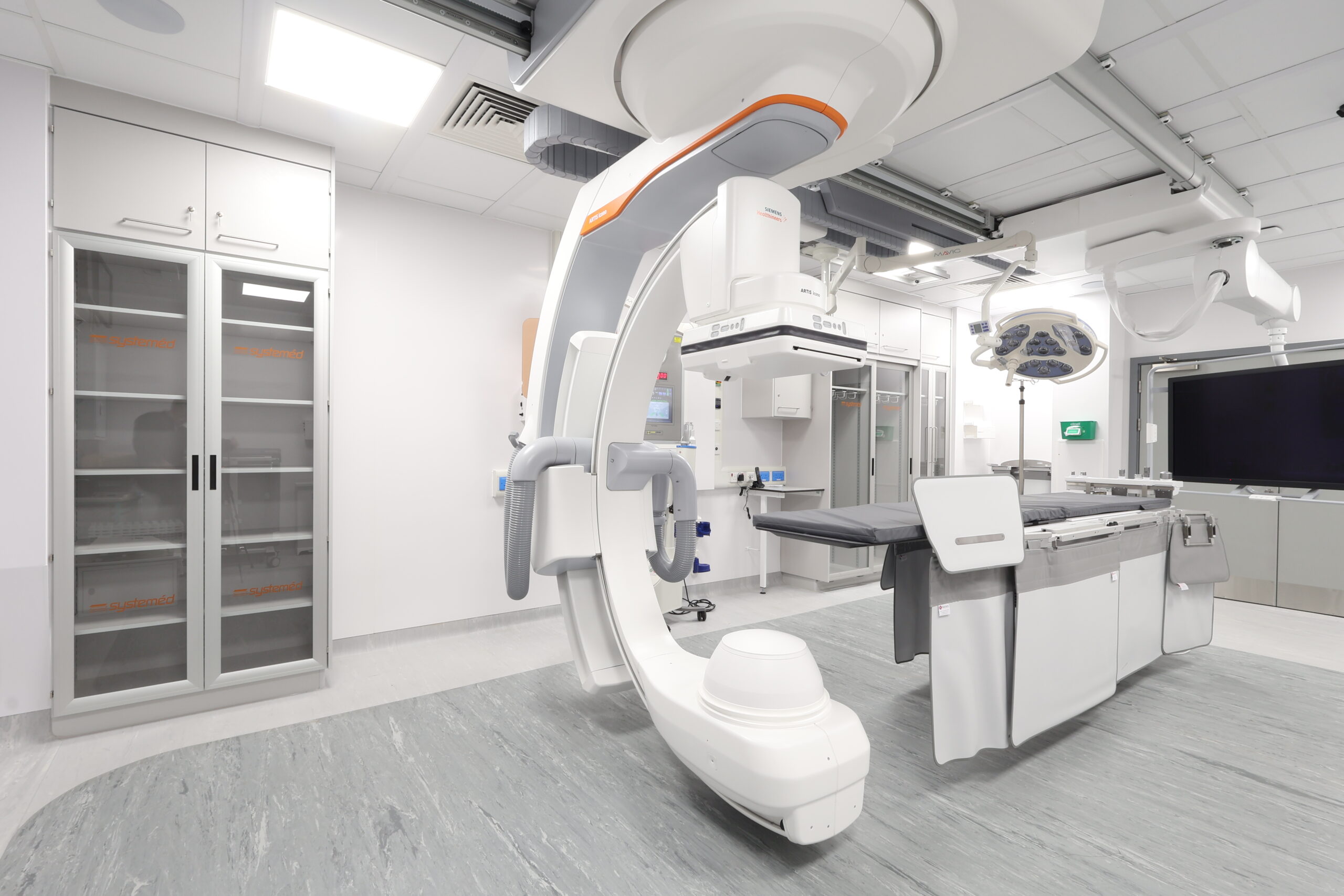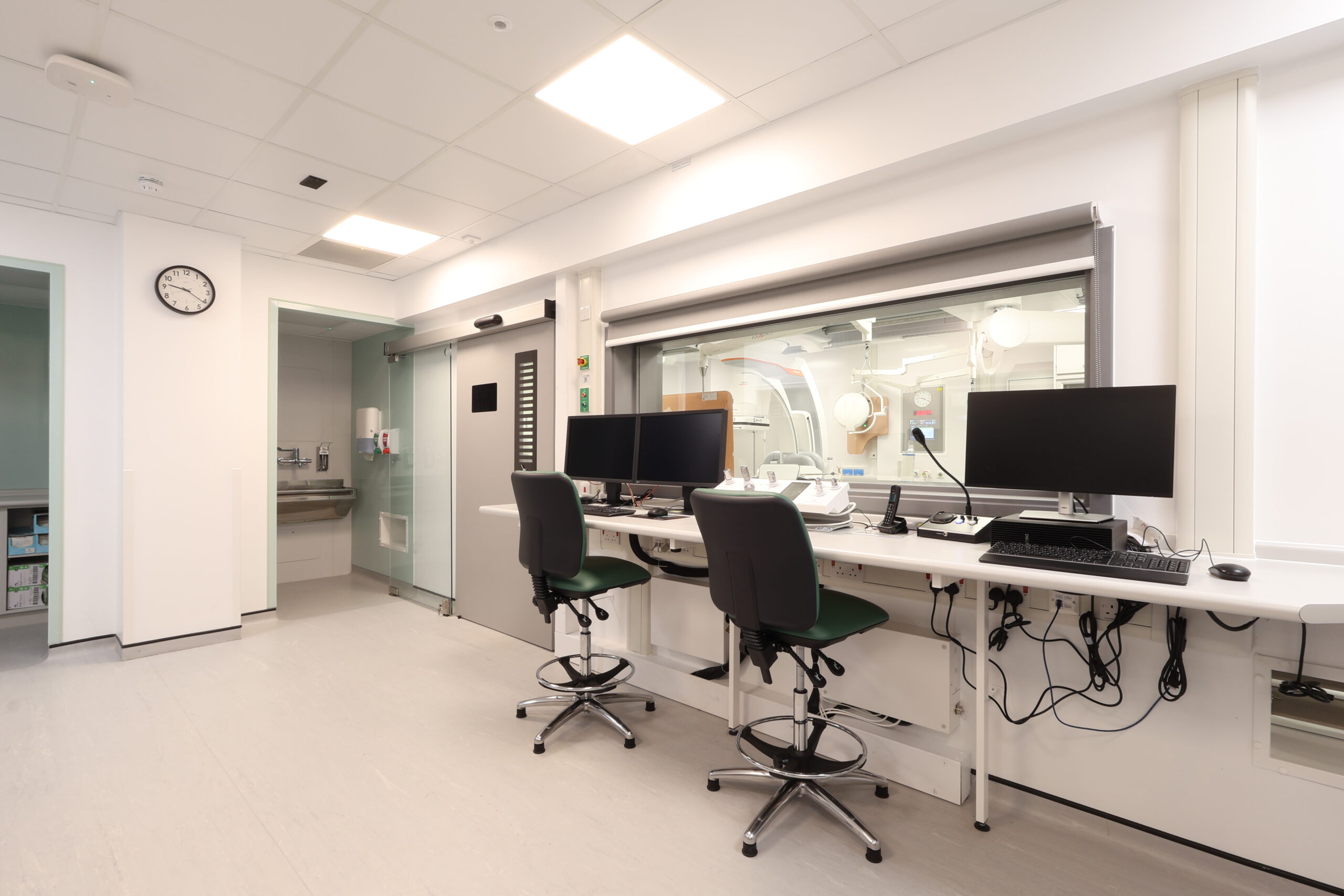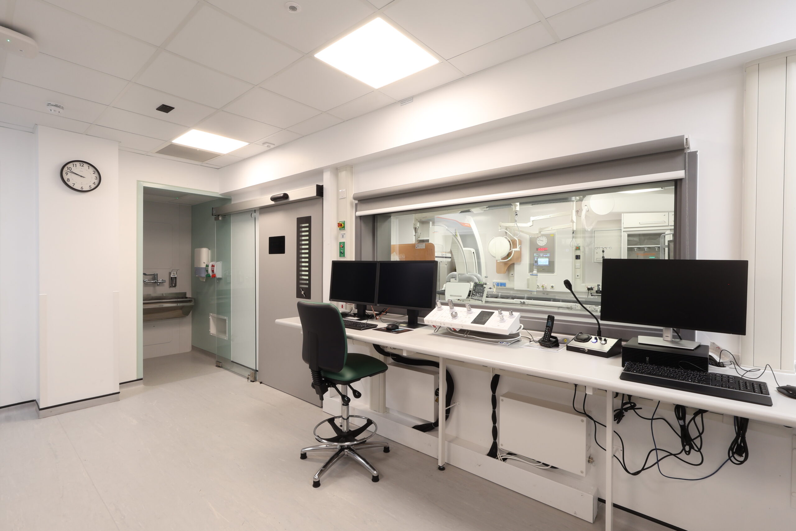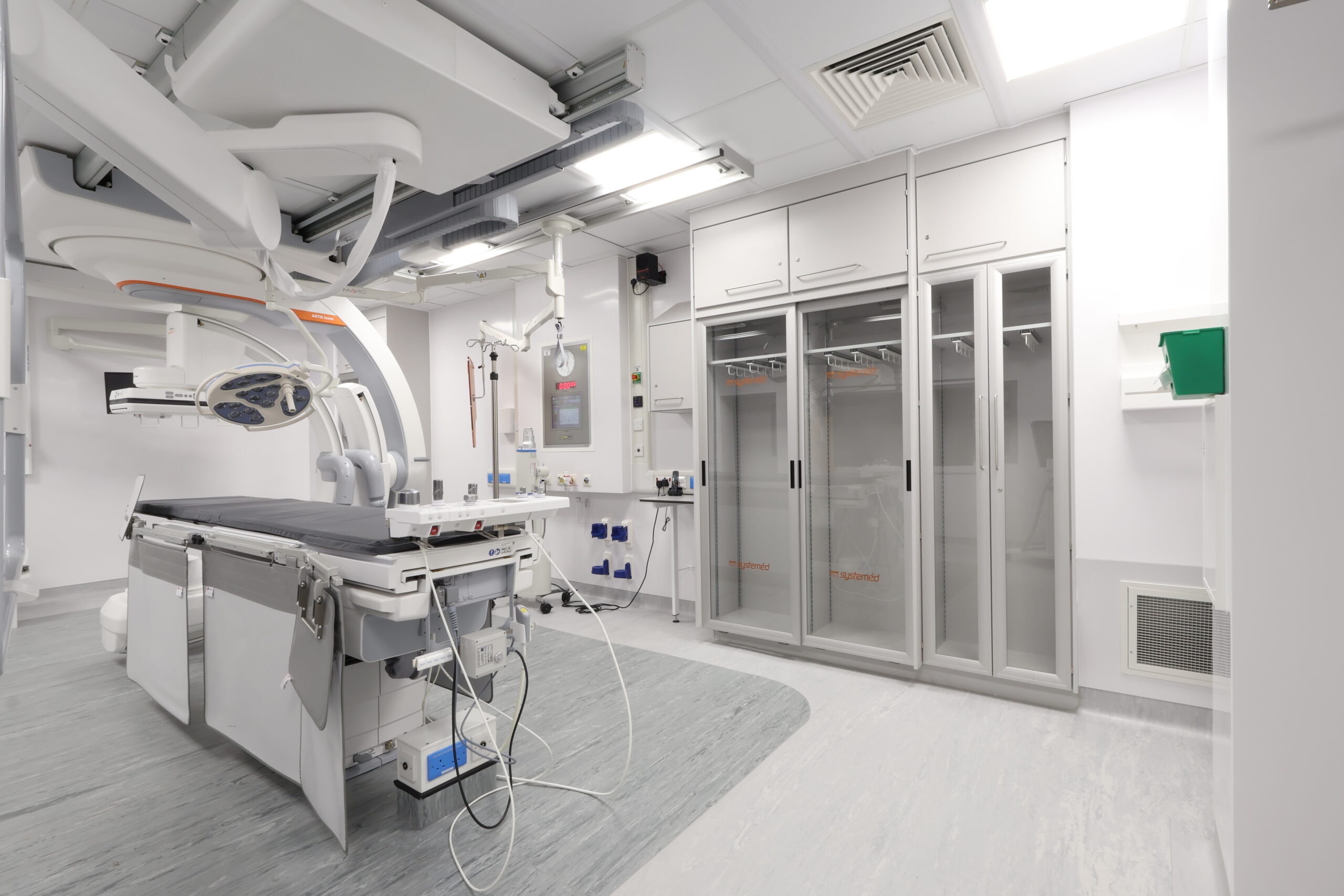 The solution included integrated modular storage, workstations and glass sliding door systems, helping to optimise space, maintain visibility and support efficient clinical workflows within a live hospital environment. The refurbished IR suite now provides a modern, functional and robust setting, designed to meet the demanding requirements of interventional procedures while supporting improved staff efficiency and patient care.