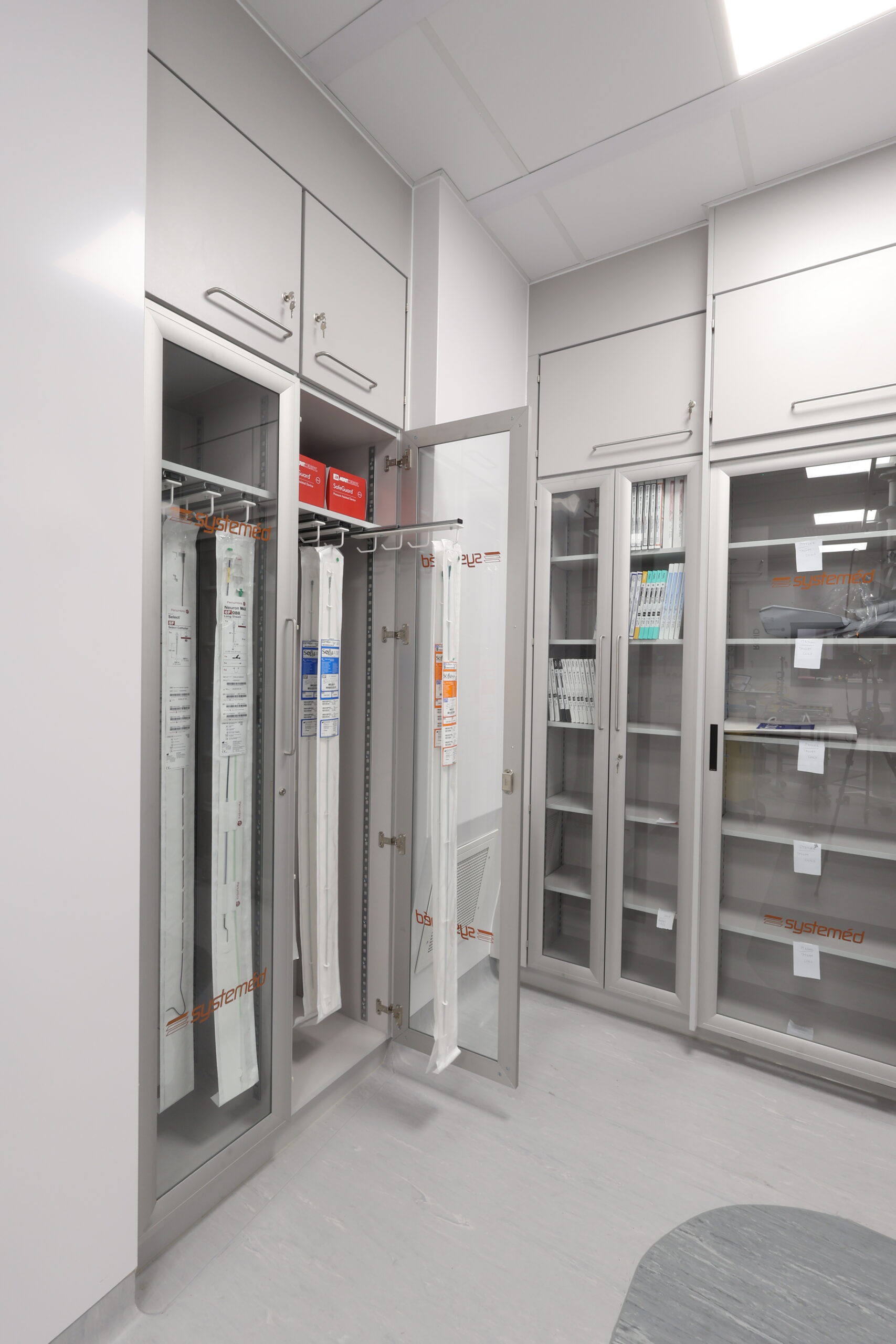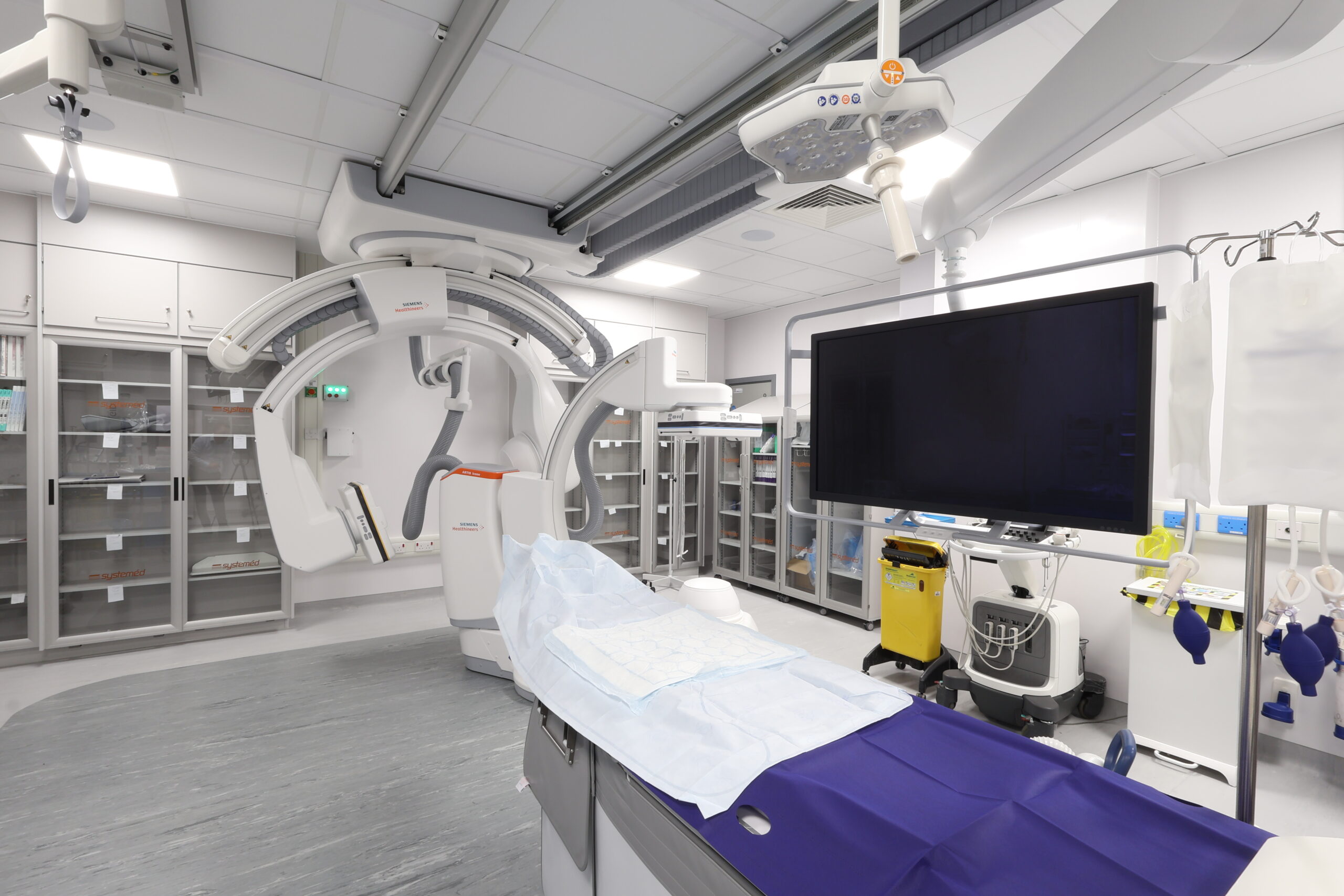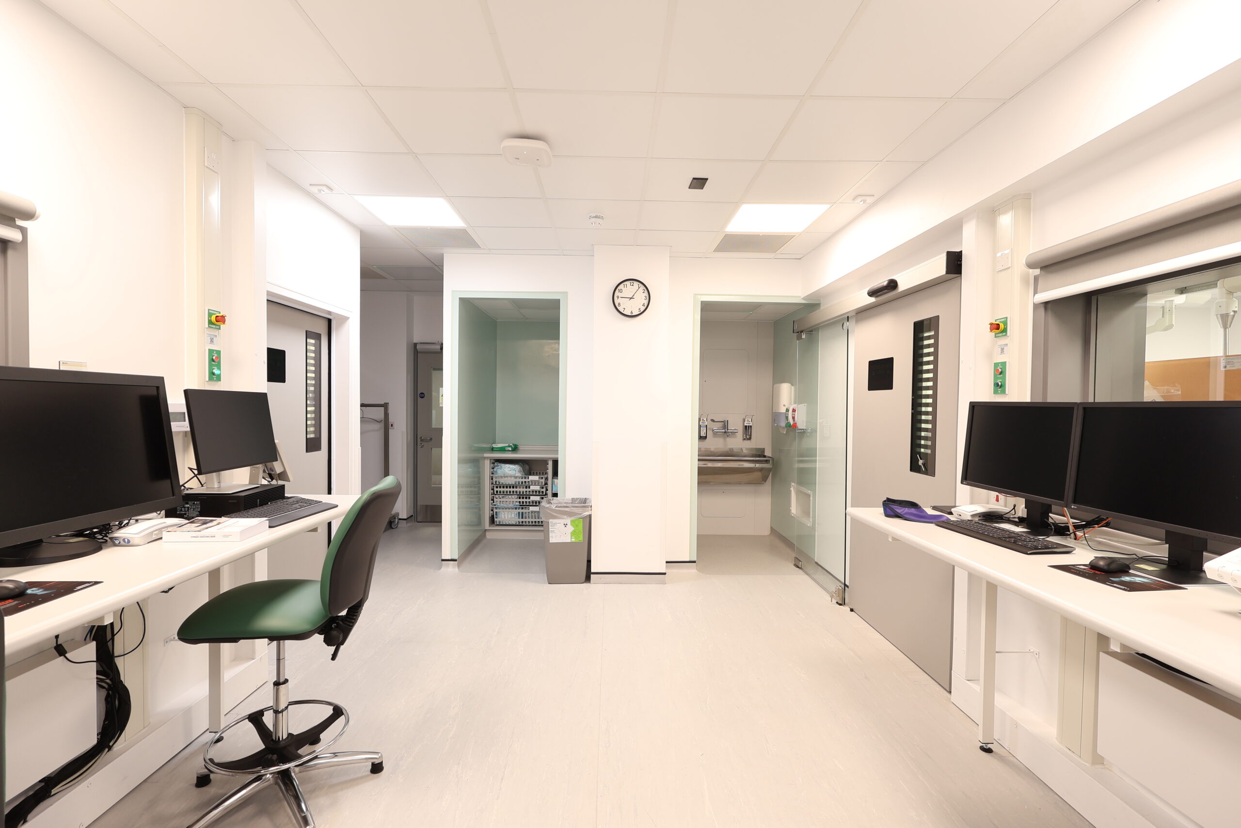 The solution included integrated modular storage, workstations and glass sliding door systems, helping to optimise space, maintain visibility and support efficient clinical workflows within a live hospital environment. The refurbished IR suite now provides a modern, functional and robust setting, designed to meet the demanding requirements of interventional procedures while supporting improved staff efficiency and patient care.