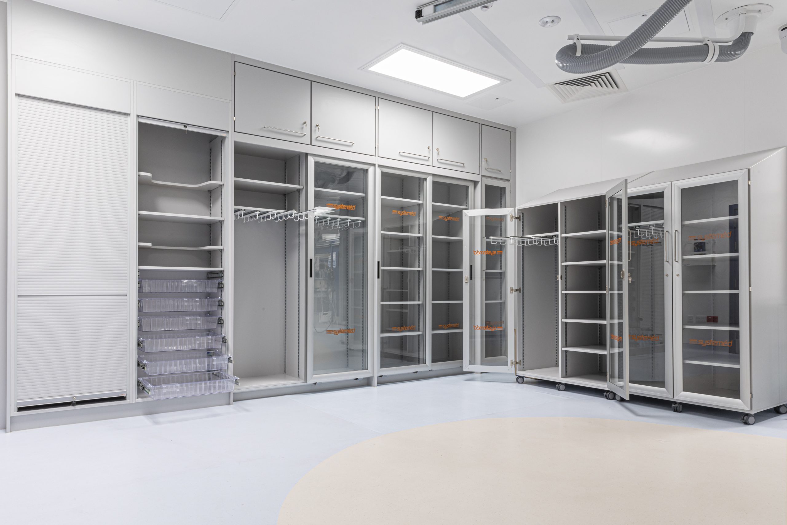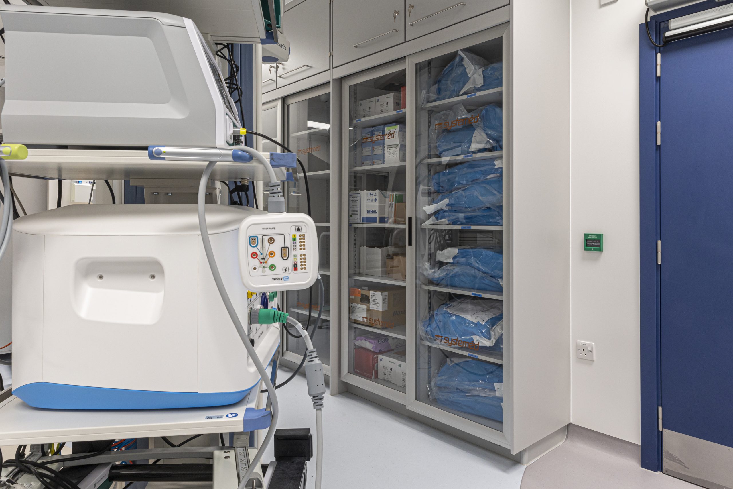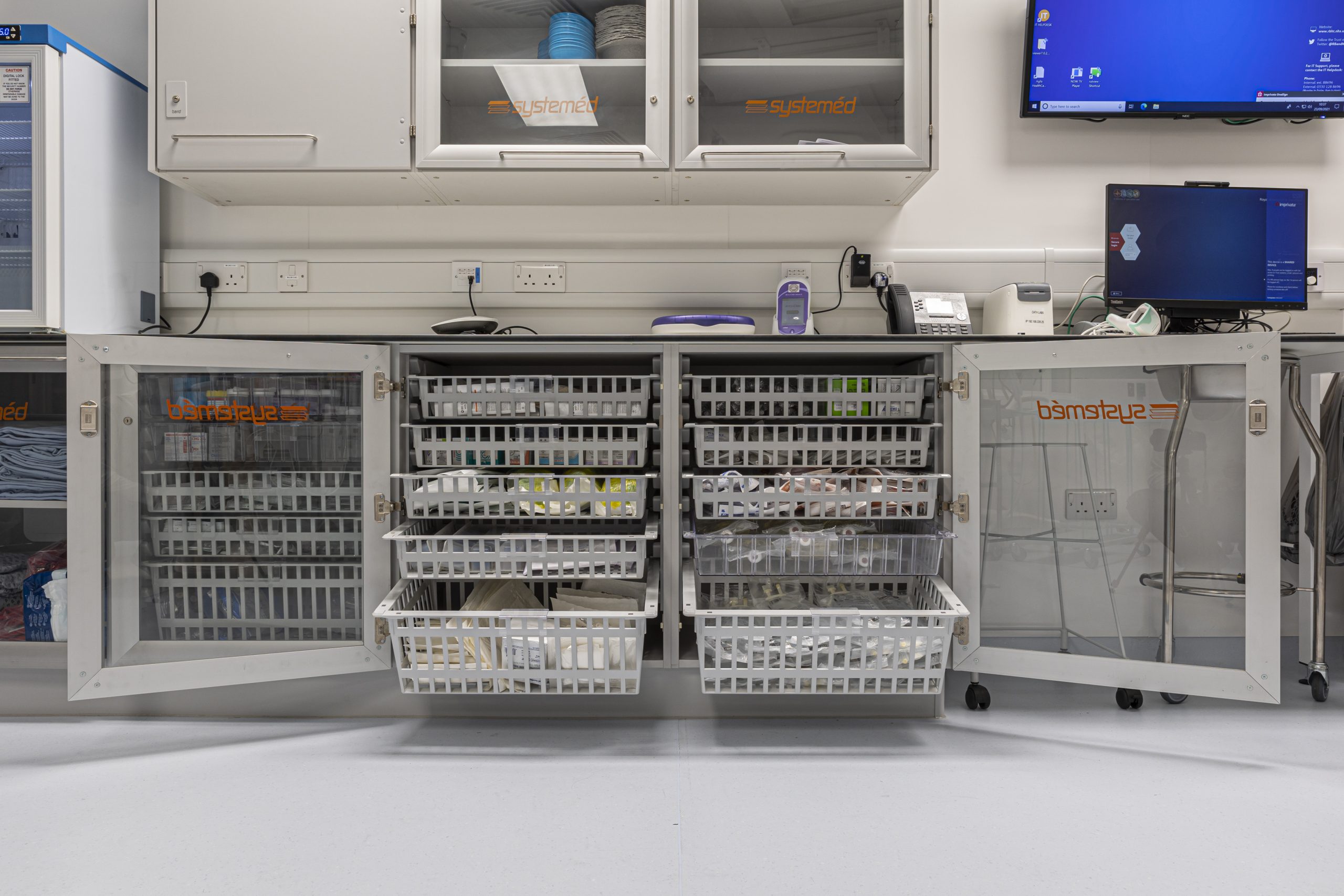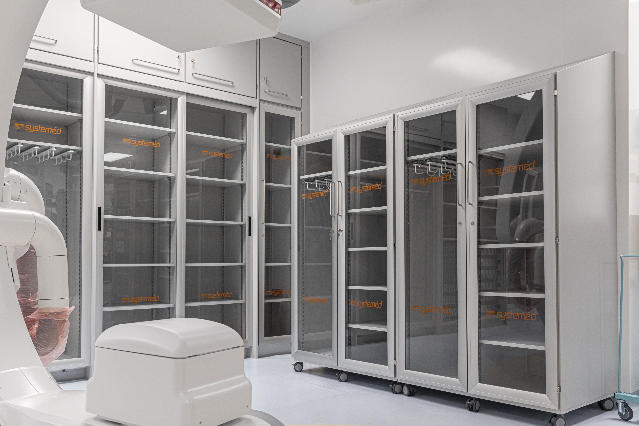 Cath Lab 3 presented particular challenges with space constraints around critical equipment. To help address these, we supplied tall, plinth-mounted and mobile Systeméd Catheter cabinets with sliding glass doors. This approach reduced the need for door swing clearance, improved stock visibility compared with tambour options, and supported a cleaner, more efficient layout.