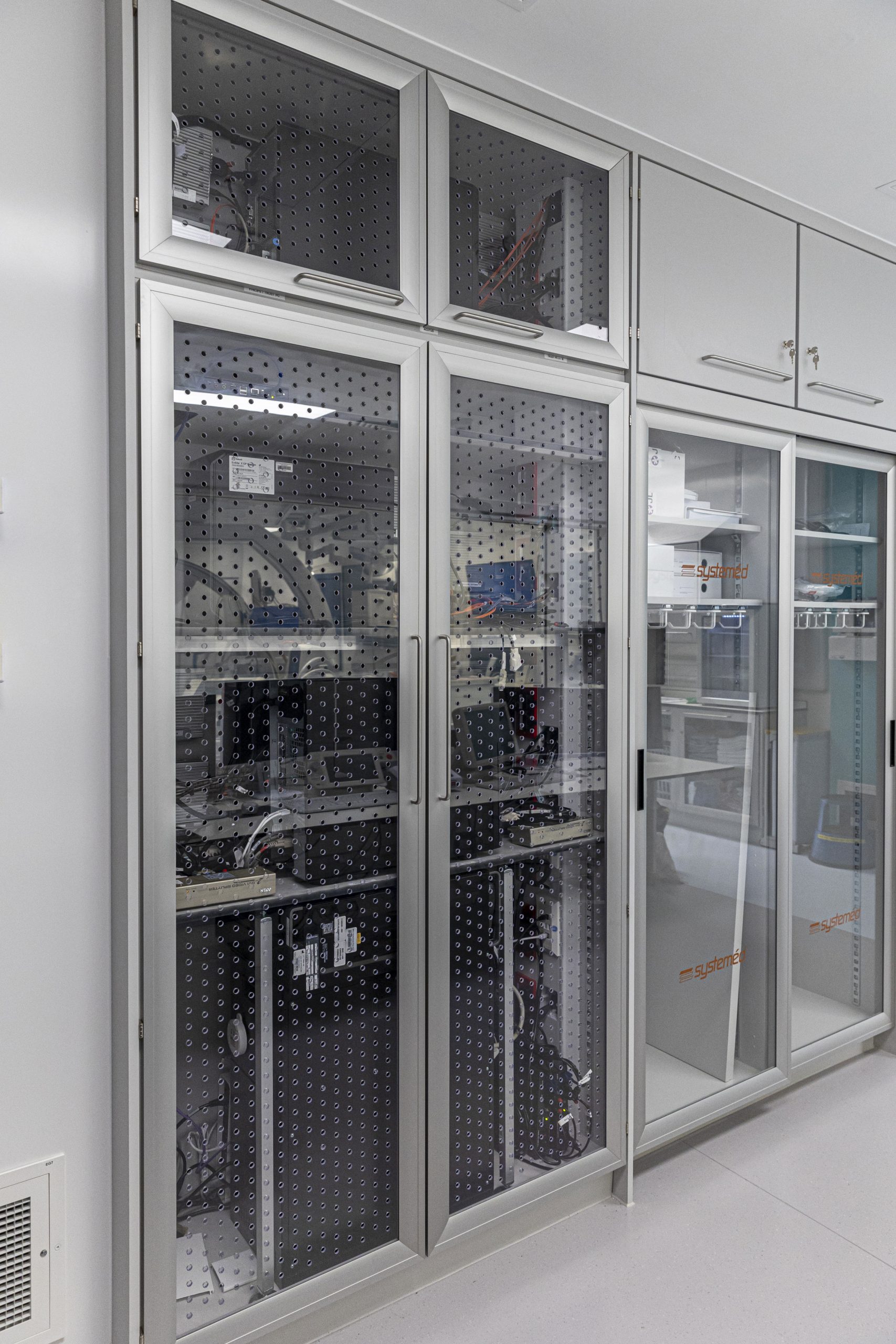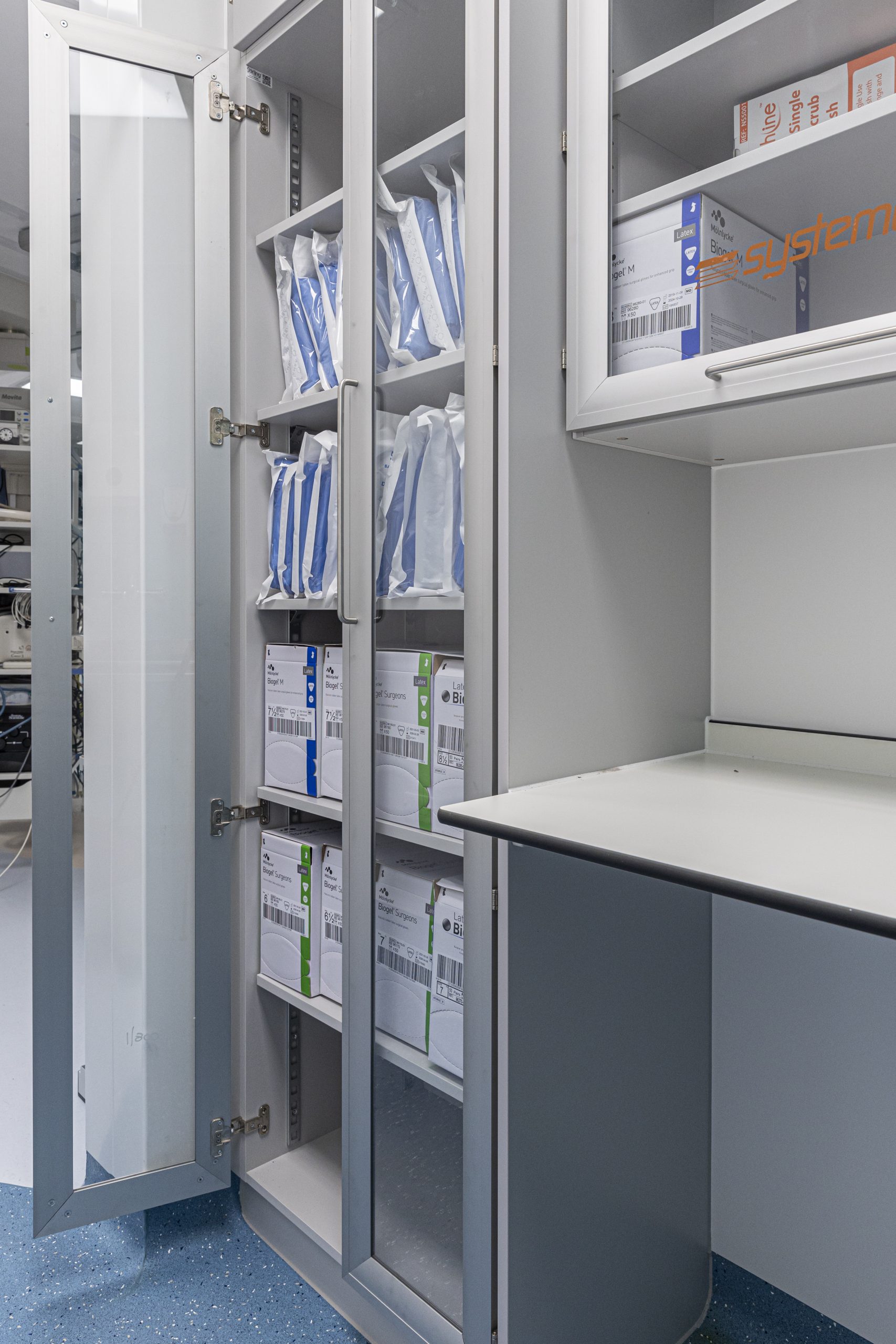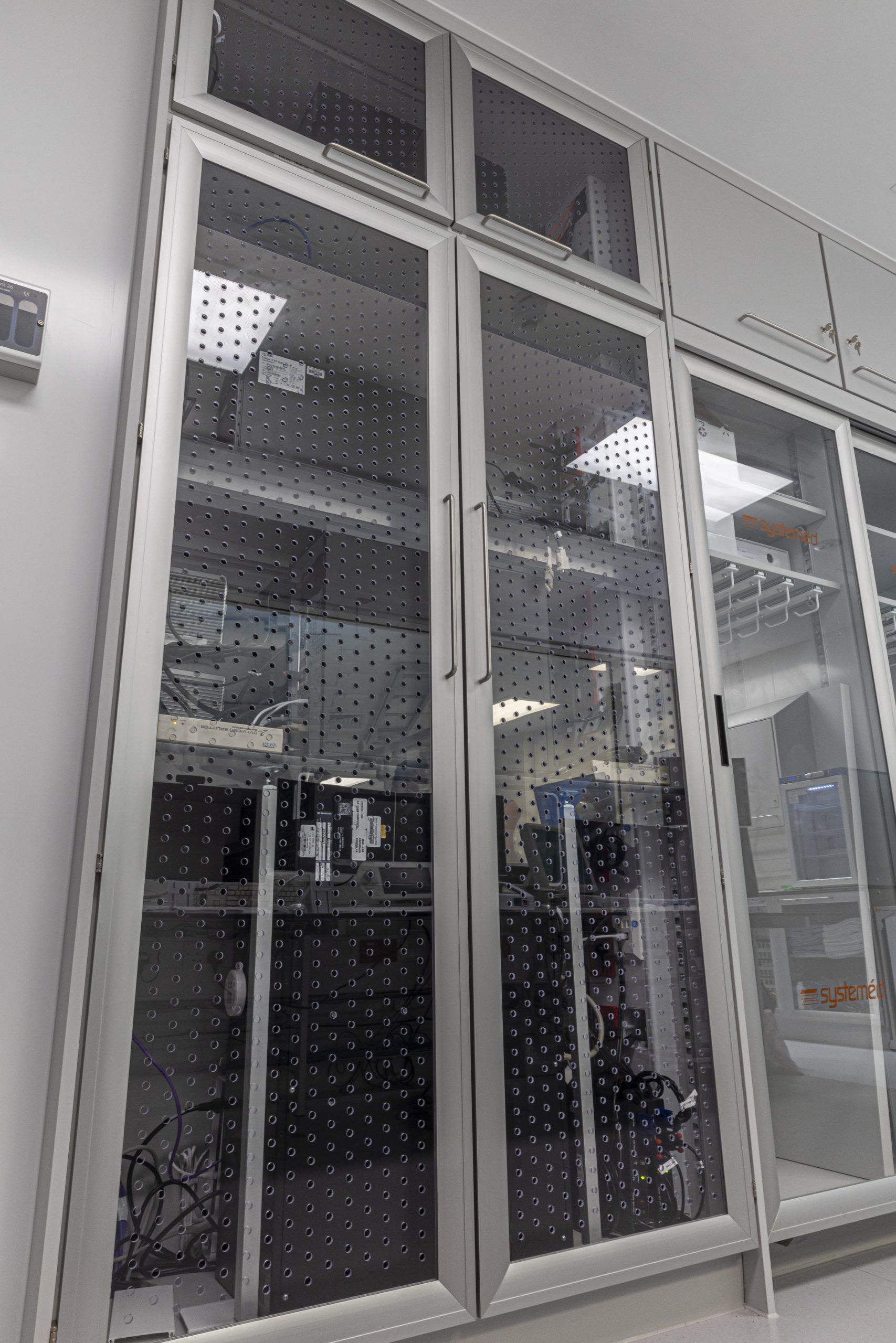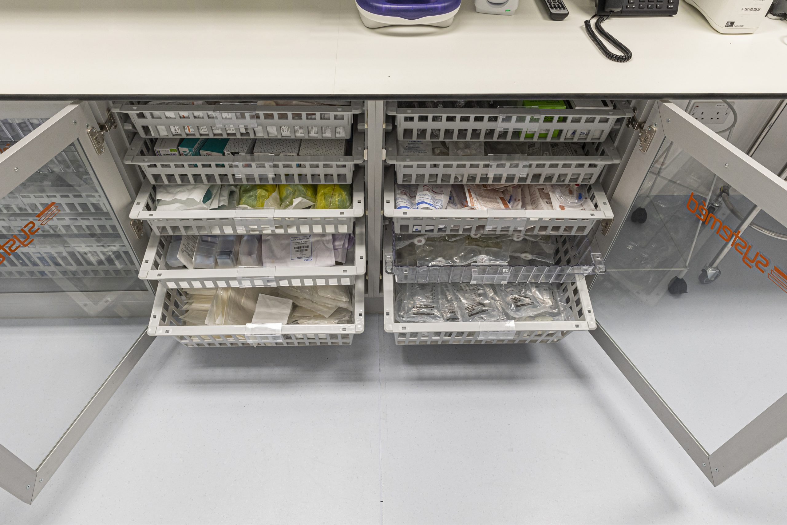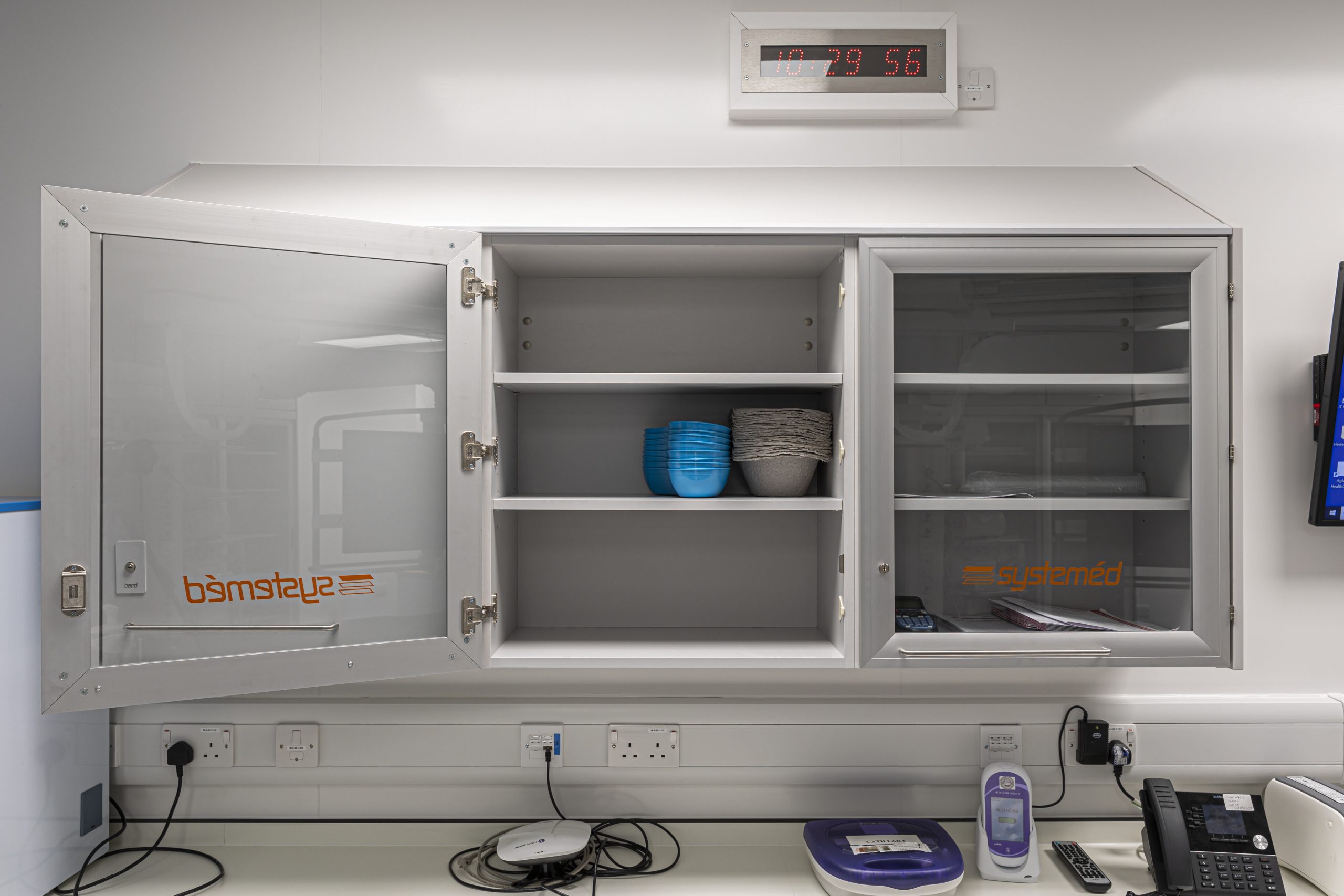 Cath Lab 3 presented particular challenges with space constraints around critical equipment. To help address these, we supplied tall, plinth-mounted and mobile Systeméd Catheter cabinets with sliding glass doors. This approach reduced the need for door swing clearance, improved stock visibility compared with tambour options, and supported a cleaner, more efficient layout.