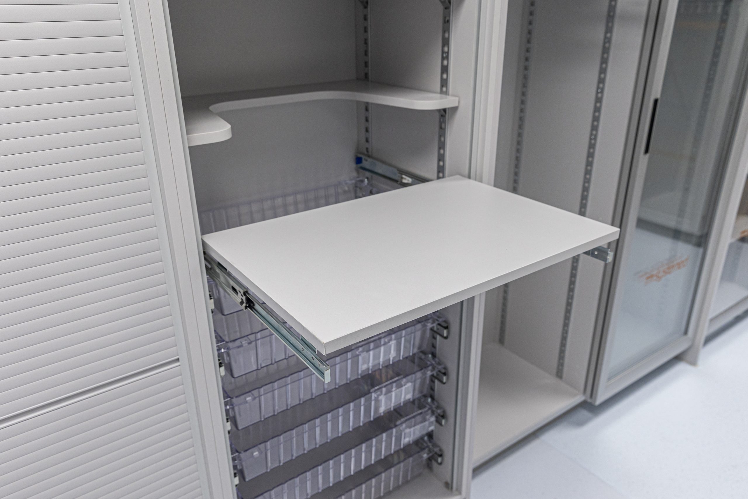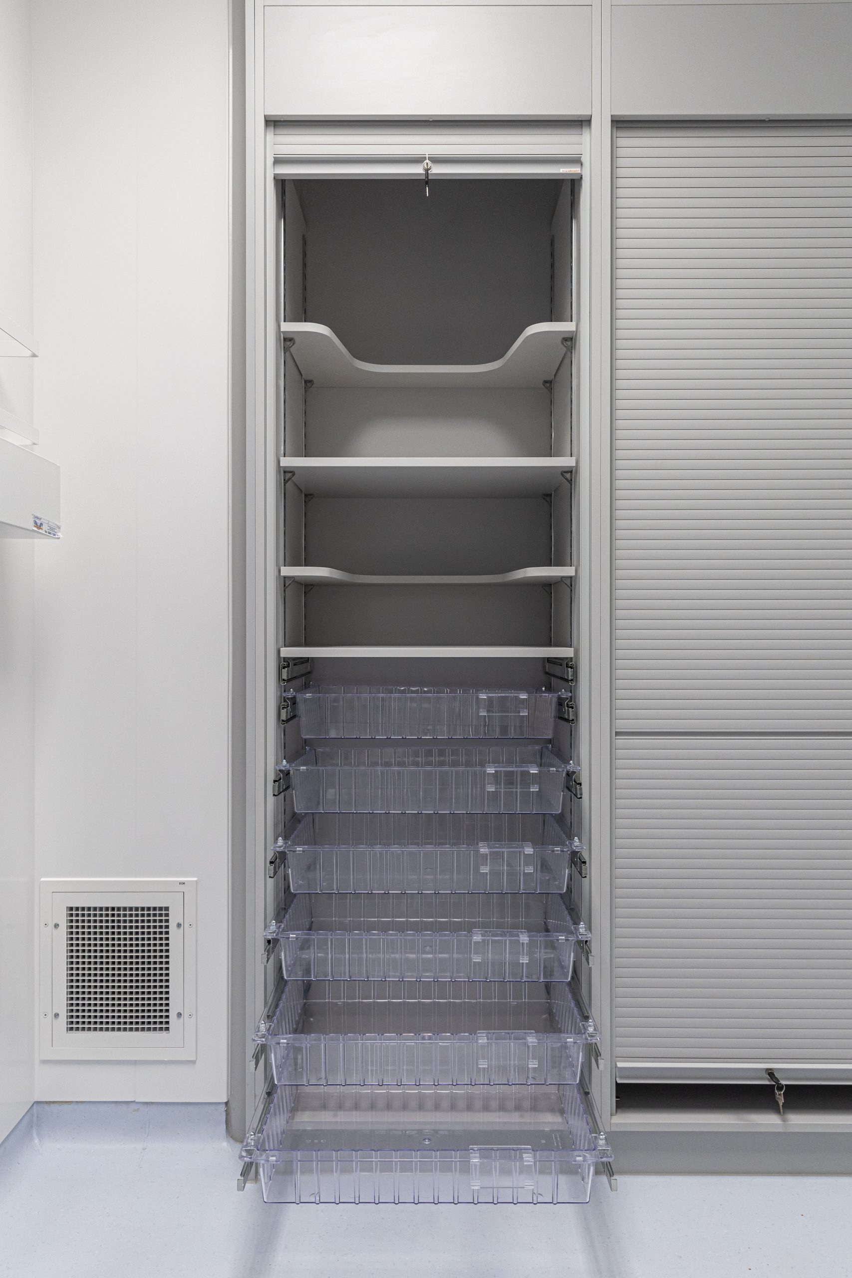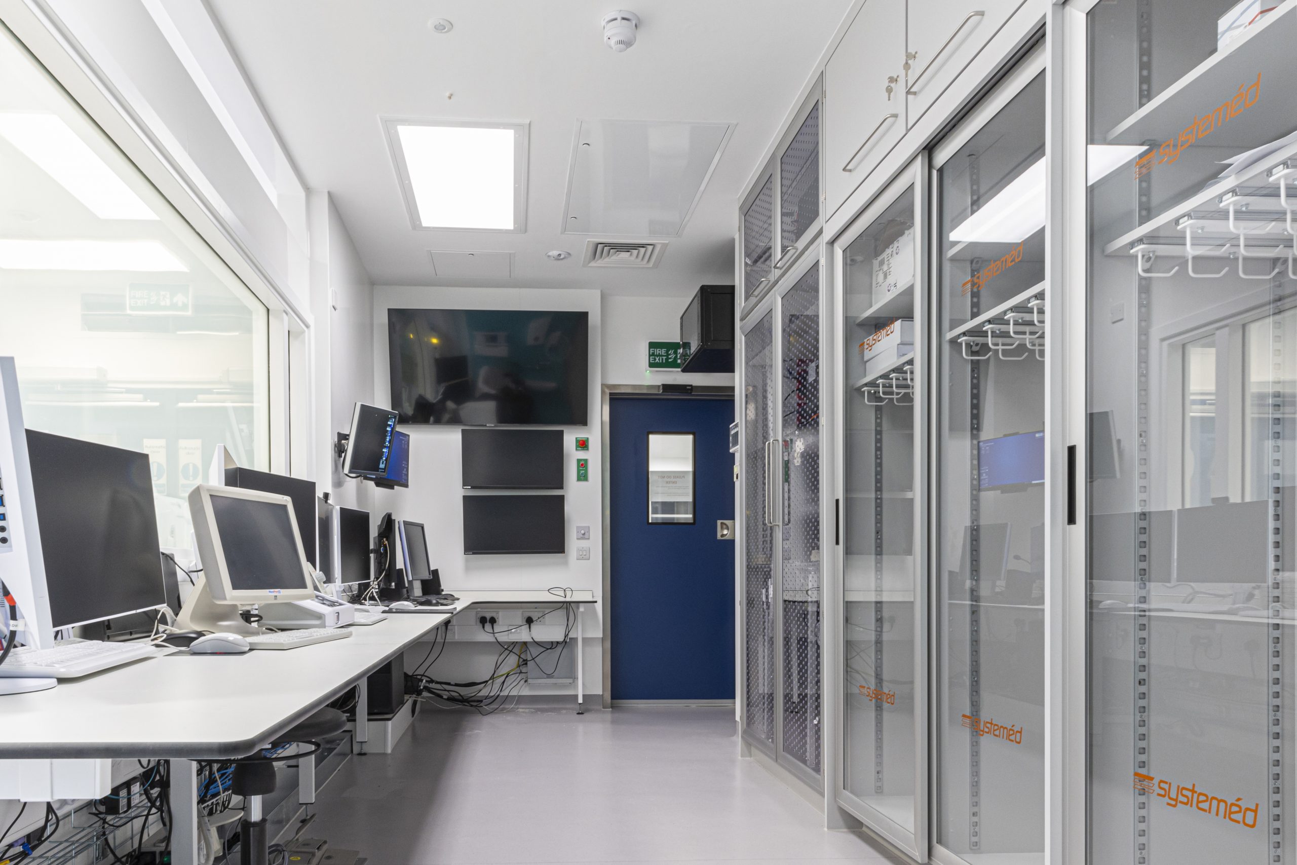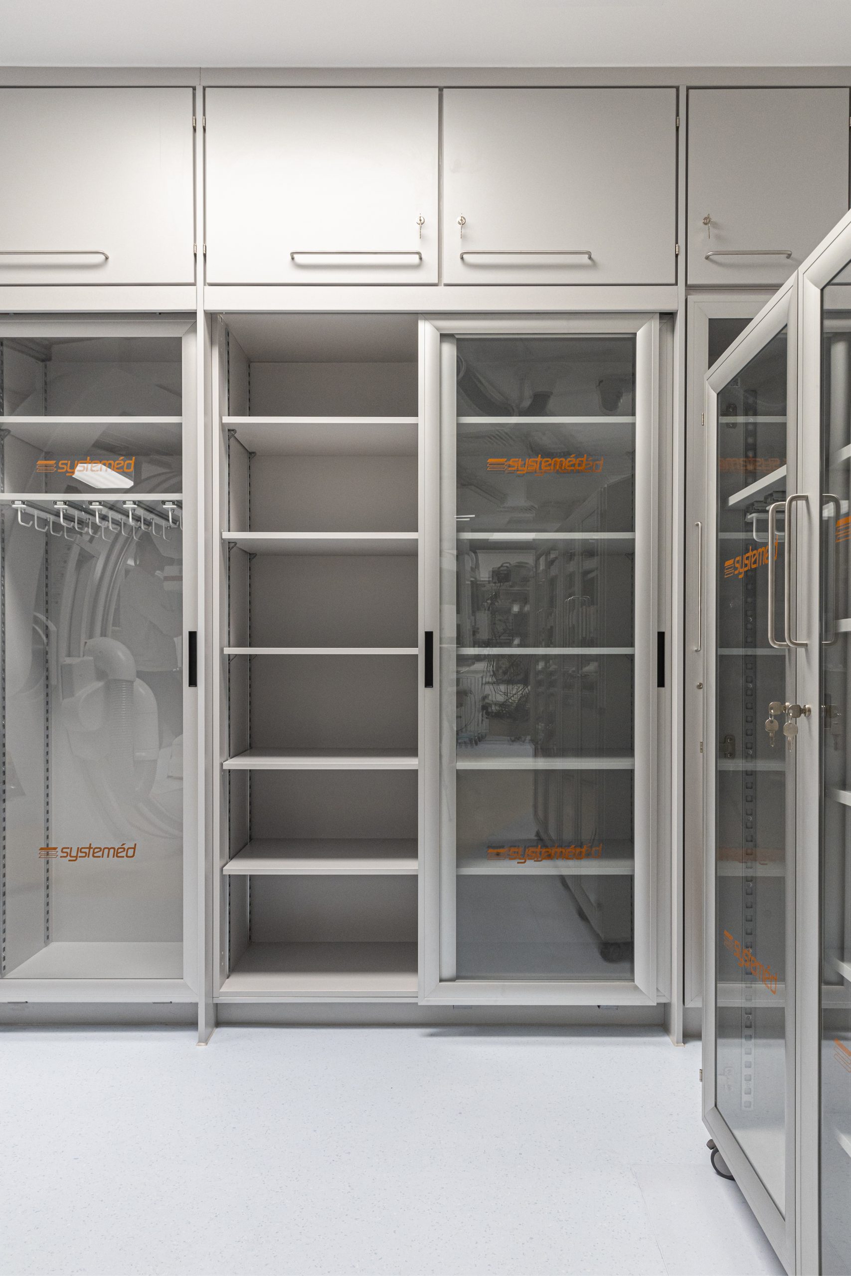 Cath Lab 3 presented particular challenges with space constraints around critical equipment. To help address these, we supplied tall, plinth-mounted and mobile Systeméd Catheter cabinets with sliding glass doors. This approach reduced the need for door swing clearance, improved stock visibility compared with tambour options, and supported a cleaner, more efficient layout.